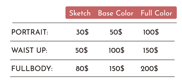 means I can use it however I want. This means I might post it on social media or my portfolio, for example. Proper credit to you will, of course, be included.⊹ You will receive a full resolution artwork of your commissioned piece and a small watermark will still be on it.⊹ The commission is only for PERSONAL USE, unless we have discussed a fee for commercial use. Read more about commercial use in the next section. You are free to print or create any merchandise, as long as it is for yourself.⊹ I can decline any commission, as well as cancelling a commission if the work affects me in a bad way.⊹ You will receive a full refund if cancelled before the work has started. You will also receive a full refund if you cancel the commission before the work has started. If you cancel after the work has started, you will receive a partial refund depending on the amount of time spent on it. There are NO refunds on completed artworks.⊹ I draw in my own style, if you want to request another art style then I am not the artist for you.⨠ COMMERCIAL USE⊹ If you desire to use the commission as a commercial piece, it would be around 200% of a higher price. Discuss it with me.⊹ Be sure to add credit in the media you are using the commission in. For example: Youtube videos, streams or personal sites.⨠ ORDERING, PAYMENT AND THE PROCESS⊹ Send a completed form to the email address stated at the top. Include all the information asked for, otherwise you will get an email back to re-fill it. The email template can be found at the top as well.⊹ Payment is through paypal, you will be sent an invoice. Payment is upfront and needs to be paid in full before I start on your commission.⊹ After we have discussed price and the commission, I will tell you that the commission is accepted and the invoice is sent. If you do not pay within 72 hours of the invoice being sent out, your commission will be cancelled and you will be put on the waiting list again.⊹ If you treat me badly or commission just to refund several times, I will blacklist you.⊹ I do not work with strict deadlines, you can expect to receive it within two weeks but it can also take up to two months.⊹ If you want your piece to have priority or a close deadline, you can pay a rush-fee.⊹ I will inform you about the general time frame when I accept your commission, judging from my current workload. This might change, but I will keep you updated if the commission is delayed.⊹ Do not rush me to finish your commission, I work when I have motivation and inspiration to do so.⊹ You will receive the sketch to accept before I finish your artwork. If you wish to see WIPs while I finish it up, ask for it as I will not automatically provide that. Don't ask for too many, as it takes up my time while working on your commission as well.⨠ CHANGES TO YOUR COMMISSION⊹ Once you receive the final piece, I can make small adjustments. This include changing colors, adding small details and other easy changes.⊹ If you want other changes to your finished commission, you need to pay a fee. This fee depends on what you need changed. If the change is the result of an error on my part (like for example missing details you included in your order), the change will be free.⊹ I will not redraw the entire piece unless you commission it as a new artwork, so make sure you are happy with the sketch and WIPs you receive.BY COMMISSIONING ME, YOU HAVE READ AND ACCEPTED ALL THE TERMS AND CONDITIONS ABOVE.